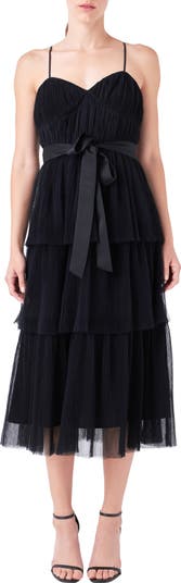 A frothy frock is cut from airy tulle and shaped by rows of ruffles.