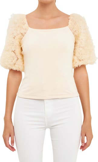 Ruffley tulle decorates the puff sleeves of this romantic blouse designed with a square neckline.
