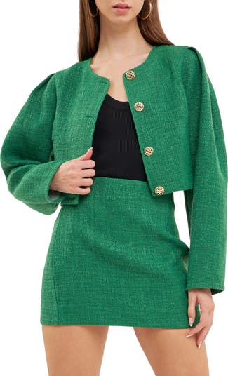 Textured tweed and goldtone buttons add to the standout look of this cropped and colorful blazer made to complement your high-waist styles.