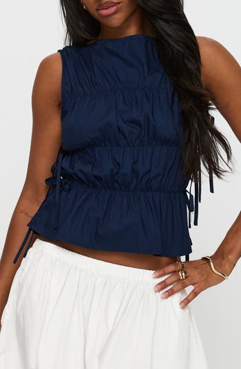 This lightweight cotton tank is the ideal sunny-day choice with its shirred details and open sides bridges by a trio of dainty ties.