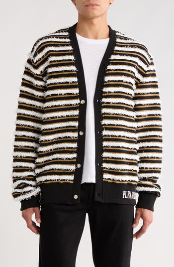 Variegated stripes textured with shaggy fringe bring an artsy-streetwear vibe to this cotton-kissed cardigan fashioned in a comfortably oversized, drop-shouldered fit.