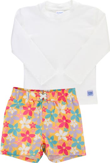 Watch baby make waves in this cute little two-piece with a solid long-sleeve rashguard top and coordinating flower-print trunks with a soft liner.