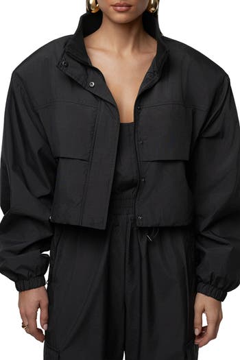 Redefine your activewear rotation with our Endure Jacket. This lightweight nylon jacket features a ribbed high collar with oversized long sleeves, functional side zippers, and a unique utilitarian flap details across the chest and back. Designed for movement and style, the elasticized hem and cuffs create a flattering, cinched fit that adapts to your body while locking in comfort. Complete with a zipper and button clasp front closure. Whether you're heading to the gym or navigating daily errands, its versatile design excels through any activity. Padded shoulders. Stretchy.