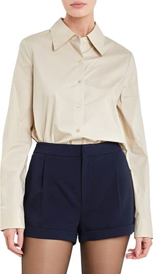 This crisp poplin shirt is designed in a longline silhouette with a curved shirttail hem.