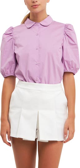 Voluminous puff sleeves and a curved collar sweeten a pastel blouse cut from crisp and airy cotton.