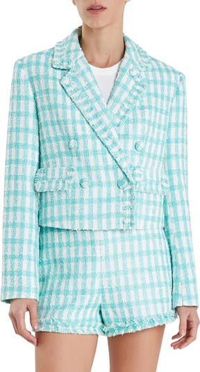 This perky pastel-check blazer features a fuzzy bouclé texture with playful touches of fringe and keeps the theme going with fabric-covered buttons.
