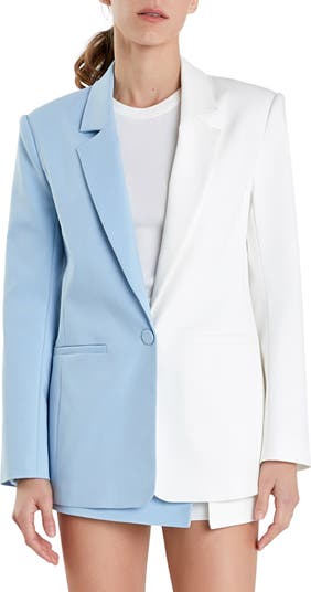 Polished and modern, this colorblocked blazer features classic menswear details like a sharp peaked lapels and welt pockets.