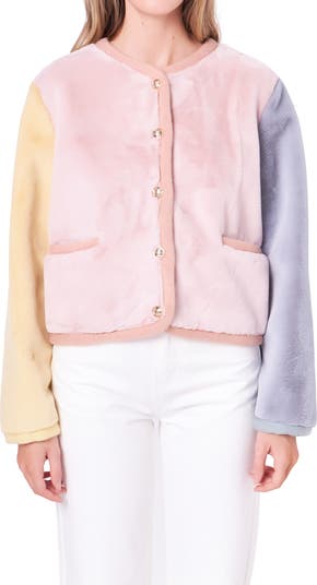 Pastel hues put a playful retro spin on a fuzzy faux-fur jacket embellished with goldtone buttons.