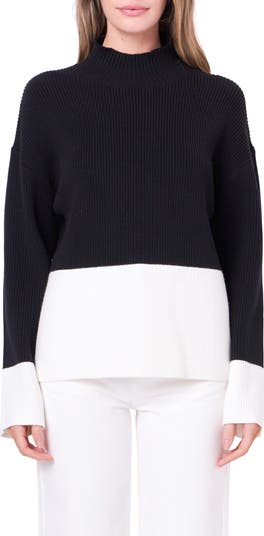 Bold colorblocking stands out on this cozy sweater knit with soft ribbing and topped with a polished mock neckline.