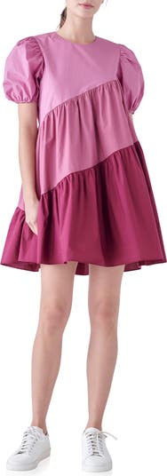 Puff sleeves perfectly frame this all-cotton minidress featuring bold asymmetric colorblocking and a flowy shift silhouette.