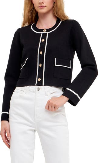 Bold contrasting trim and gleaming goldtone buttons lend retro allure to a cropped cardigan fashioned with handy flap pockets.