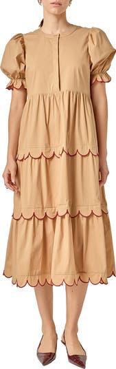 Stylish embroidery trims the scalloped edges of this tiered midi dress made from lightweight cotton and framed by pretty puff sleeves.