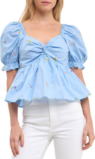 Colorful embroidered flowers bring delicate charm to a graceful babydoll top framed by ruffled puff sleeves and a sweetheart neck.