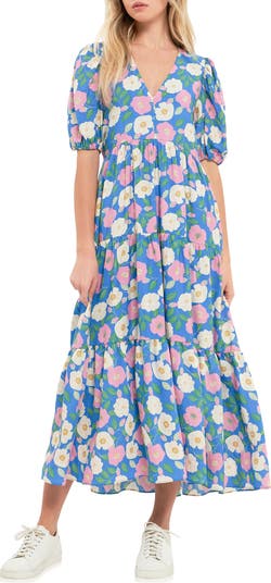 A sweet floral midi dress showcases romantic tiers and a relaxed fit for picnic-ready style.