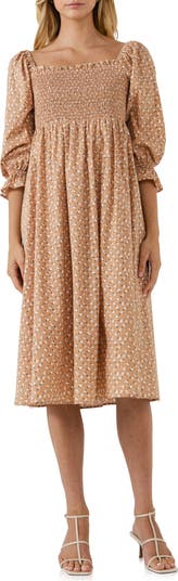 A ditsy floral print covers a muted long-sleeve midi dress with a smocked bodice, blouson sleeves and a twirly skirt.