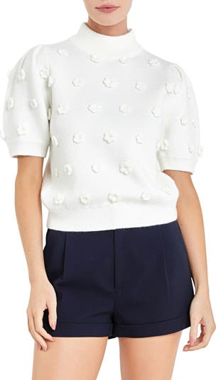 Flower-shaped pompoms cover this cozy rib-trimmed sweater knit with a mock neckline and lightly puffed short sleeves.