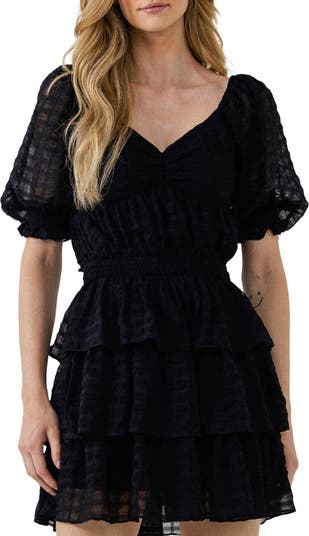 Puffed short sleeves frame this lightweight gingham chiffon blouse topped with a face-framing V-neckline.