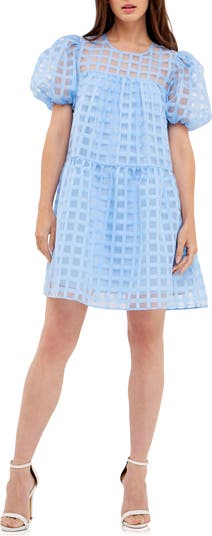 Puffy sleeves add instant drama to this party-ready dress covered in a sheer grid overlay.