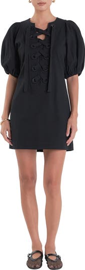 Oversized laces and grommets on the front lend eclectic style to a sweet cotton minidress framed by vintage-inspired puff sleeves.