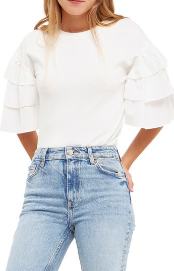Layered ruffles flutter at the sleeves of this clean-white knit top.
