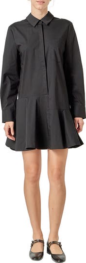 A swingy flounce adds a fun flourish to a long-sleeve shirtdress in a lightweight cotton blend.