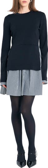 Get to the fun faster in a one-and-done dress that presents like a pullover worn over a cheery checked frock.