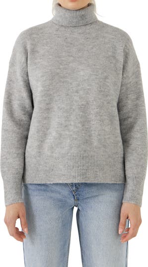 This relaxed turtleneck sweater is knit with dropped shoulders and a pointelle pattern in back that ends at a contemporary double-notched hem.