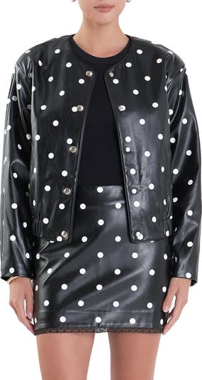 Sweetness meets swagger with a dot-dappled jacket cut from supple faux leather.