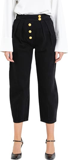 Sport a retro look in menswear-inspired trousers reimagined in faded denim with engraved buttons to spotlight the pleated high waist.