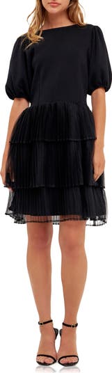 Beautiful pleated mesh overlays the voluminous skirt of this open-back knit minidress framed by frothy puff sleeves.