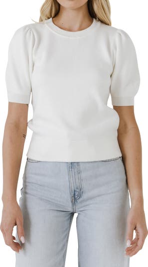 Ribbed trim updates the neck, cuffs and hem of a stylish sweater framed by short puff sleeves.