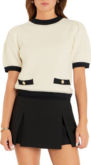 Inky trim emboldens this fuzzy-textured sweater sweetened by darling puff sleeves.