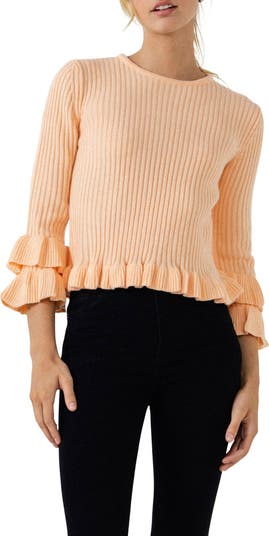 Ruffled edges add abundant charm to a soft and fuzzy rib-knit sweater with on-trend three-quarter-length sleeves.