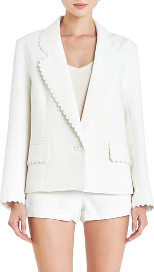 Scalloped trim brings chic style to this charming blazer crafted in a one-button silhouette.