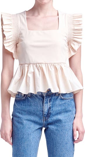Ruffle cap sleeves highlight your shoulders and enhance the charm of a square-neck top made with a frilly peplum.