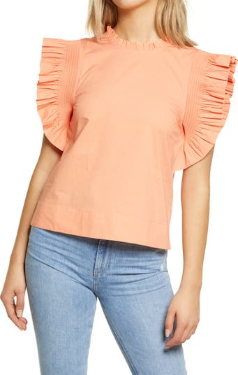 Frilly ruffles bring unmistakable volume to the shoulders of a chic blouse cut from crisp cotton.