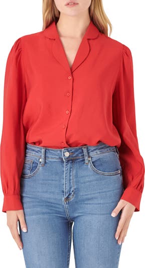 Polish meets charm on this front-button blouse designed with a scalloped notched collar and billowed sleeves.