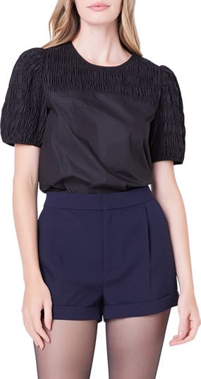 Slightly puffed sleeves and smocking sweeten the look of a cotton-forward top punctuated by a back keyhole detail.
