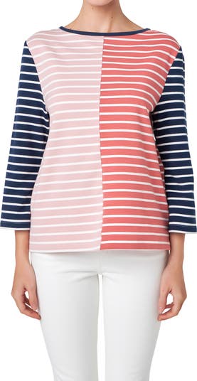 A striking blend of colorblocking and stripes makes this three-quarter-sleeve top stand out in a crowd.