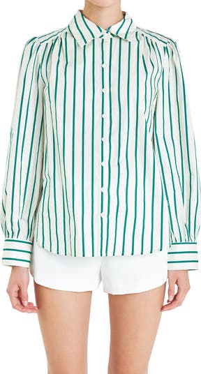 Polish meets charm on this poplin shirt designed with puff shoulders and blushing stripes.