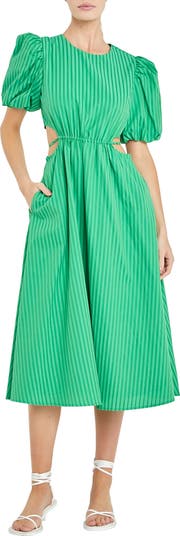 Allover stripes enliven this charming puff-sleeve dress designed with airy waistline cutouts.