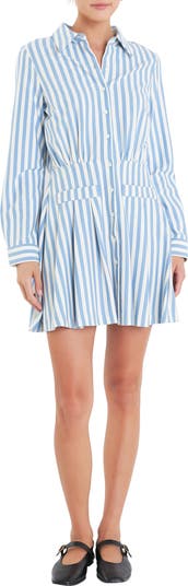 Allover stripes bring eye-catching appeal to this cotton-blend shirtdress designed with a fitted waist and a swingy flared skirt.