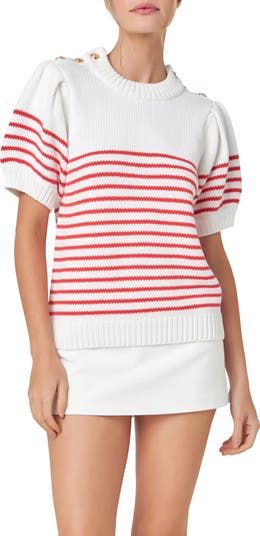 Gleaming goldtone buttons punctuate the shoulders of this short-sleeve sweater wrapped in stripes.