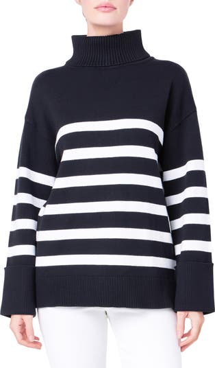 Feel the warmth of this longline turtleneck sweater knit with lively stripes and ribbed trim.