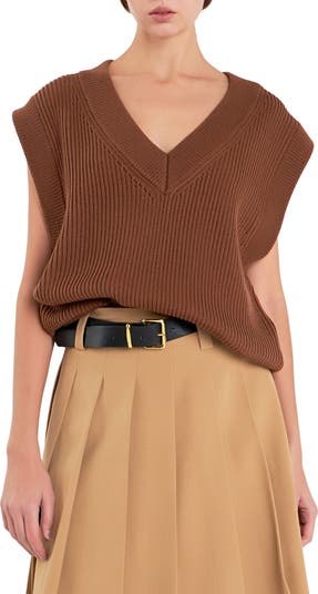 Love to layer in this warm woolly sweater-vest knit with a dipped neckline.