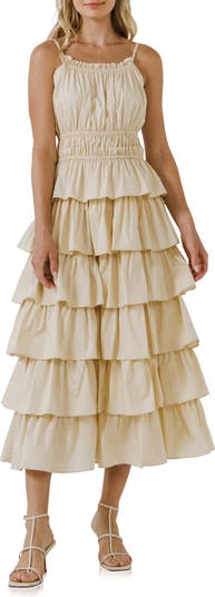 Delicate shirring and voluminous tiers bring elegant dimension to an ankle-grazing cotton dress that will complement your warm-weather wardrobe.