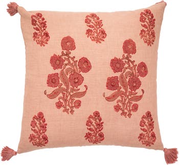 Delicate floral print in Coral, Clay & Sand on Rose. 20″ x 20″ Knife edge decorative pillow cover with yarn tassel detail. Hand screen printed by artisans. 100% Linen Pillow Cover with cotton lining. Hidden zipper enclosure. Insert not included. Handmade in India.