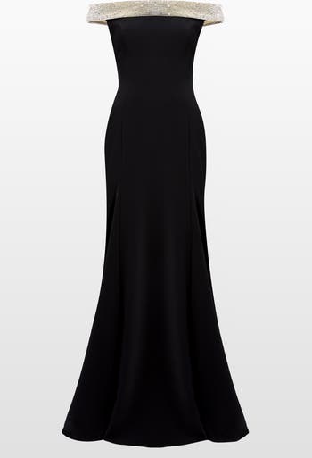 This enchanting gown gown exudes timeless sophistication with a clean, modern silhouette. The off-the-shoulder neckline is framed by a shimmering band of beading, adding subtle sparkle to the minimalist design. The fitted bodice flows into a gently flared skirt, creating an elegant, elongated shape. A refined choice for occasions that call for effortless grace and understated glamour.