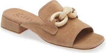 Wooden chain-link detailing and a loafer-inspired topline add modern sophistication to a slide sandal balanced by a squared-off toe and low block heel.