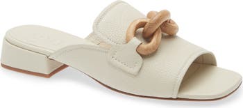 A loafer-inspired topline refines a leather slide sandal topped with a chunky wooden chain link for organic texture.